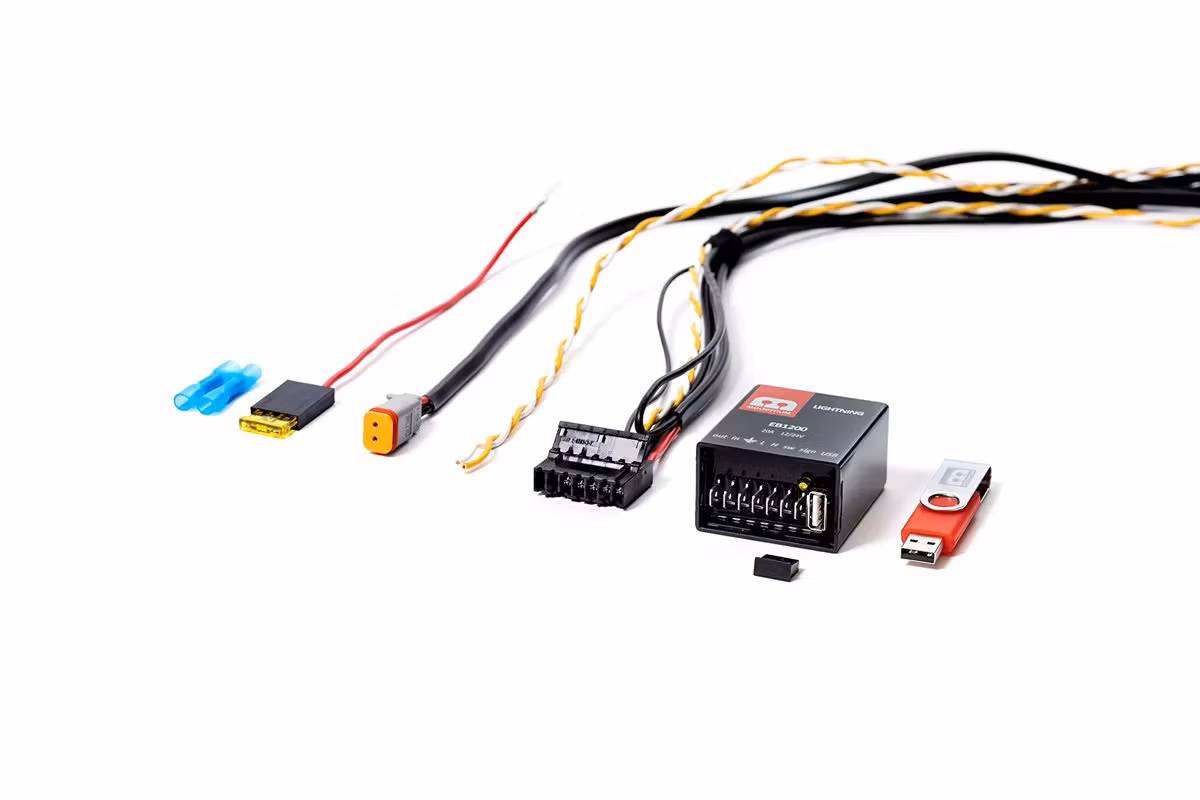 Då många moderna bilar saknar en analog 12 volts signal till helljuset använder man detta interface/kablage.