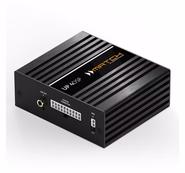 MATCH UP 4DSP är ett kompakt DSP-slutsteg utvecklat för att uppgradera bilens originalsystem med minimal installation. Med 4 förstärkta kanaler och en separat DSP-styrd subwooferutgång får du ett komplett system i ett enda steg – perfekt för fram/bak + subwoofer utan att byta huvudenhet.